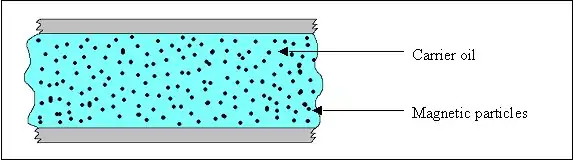 The magnetic particles, which are typically micrometer or nanometer scale spheres or ellipsoids, are suspended within the carrier oil and distributed randomly in suspension under normal circumstances, as below.