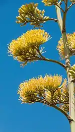 The plant blooms once it reaches its peak ripening stage, between 7 and 15 years of age.[3] The enormous stem sprouts from its center, which can reach up to 10 m. The maguey only blooms once in its entire life. After that, it dies.[2]
