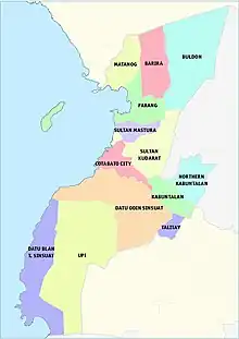 Maguindanao del Norte, officially the Province of Maguindanao del Norte (Maguindanaon: Dairat nu Pangutaran Magindanaw, Jawi: دايرت نو ڤڠوترن ماڬينداناو; Iranun: Perobinsia a Pangutaran Magindanao, ڤروبنسيا ا ڤڠوترن ماڬينداناو), is a province in the Philippines located in the Bangsamoro Autonomous Region in Muslim Mindanao in Mindanao. Its capital is the municipality of Datu Odin Sinsuat. It borders Cotabato province to the east, Lanao del Sur to the north, Maguindanao del Sur to the south-east, and Sultan Kudarat to the south.