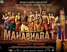 Mahabharat is a 2013 Indian Hindi-language animated film, directed by Amaan Khan and based on the Hindu epic of the same name.[3][4] The film is produced by Kushal Kantilal Gada and Dhaval Jayantilal Gada.[5] The film was a Christmas release on 27 December 2013.[6] Several actors like Amitabh Bachchan, Sunny Deol, Ajay Devgn, Anil Kapoor, Jackie Shroff, Vidya Balan, Manoj Bajpayee, Deepti Naval were signed up for the characters in the film.[7][8][9][10][11][12] It is touted as the most expensive animated film in Bollywood.[13][14][15] The movie tells the story of the Indian epic Mahabharata. It received mixed reviews, with praise for its voice acting, but criticism for its animations.