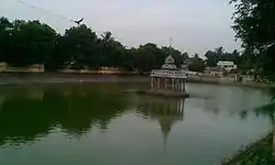 The name "Kumbakonam", roughly translated in English as the "Jug's Corner",[2] is believed to be an allusion to the mythical pot (kumbha) of the Hindu god Brahma that contained the seed of all living beings on earth. The kumbha is believed to have been displaced by a pralaya (dissolution of the universe) and ultimately came to rest at the spot where the town of Kumbakonam now stands.[3][4] The drops of nectar are believed to have fallen onto five shrines around Kumbakonam, namely Mahalingeswarar temple at Tiruvidaimarudur, Tirudharasuram, Naganathar Temple at Tirunageswaram, Tiruvorgam and Tirupadalavanam.[5]