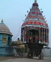 The temple priests perform the pooja (rituals) during festivals and on a daily basis. Like other Shiva temples of Tamil Nadu, the priests belong to the Shaivaite community, a Brahmin sub-caste. The temple rituals are performed six times a day; Ushathkalam at 6:00 a.m., Kalasanthi at 8:00 a.m., Uchikalam at 12:00 p.m., Sayarakshai at 6:00 p.m., Irandamkalam at 8:00 p.m. and Ardha Jamam at 9:00 p.m. Each ritual comprises four steps: abhisheka (sacred bath), alangaram (decoration), neivethanam (food offering) and deepa aradanai (waving of lamps) for both Mahalingeswarar and Pirguchuntaragujambigai. The worship is held amidst music with nagaswaram (pipe instrument) and tavil (percussion instrument), religious instructions in the Vedas read by priests and prostration by worshippers in front of the temple mast. There are weekly rituals like somavaram and sukravaram, fortnightly rituals like pradosham and monthly festivals like amavasai (new moon day), kiruthigai, pournami (full moon day) and sathurthi.[23] The most prominent festival of the temple, Thaipoosam, is celebrated for ten days during the Tamil month of Thai.[7][23] The festival deity of Mahalingeswarar and his consort circumambulate the temple and the streets in the village in different vehicles. The festival ends with Theerthavari on the last day. During the Tamil month of Vaikasi, Tirukalyanam (sacred marriage), Ambal Tapasu (penance of Ambal), Ambal Thannai thaane festivals are celebrated.[23]