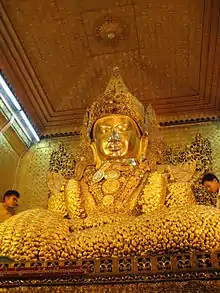 The Mahamuni Buddha Temple (Burmese: မဟာမုနိရှင်တော်မြတ်ကြီး, Burmese pronunciation: [məhà mṵnḭ pʰəjádʑí]) is a Buddhist temple and major pilgrimage site, located southwest of Mandalay, Myanmar (Burma).[1] The Mahamuni Image (lit. 'The Great Sage') is enshrined in this temple, and originally came from Arakan.[2] It is highly venerated in Burma and central to many people's lives, as it is seen as an expression of representing the Buddha's life.[3]