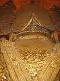 The Mahamuni Temple or Pagoda is a complex of structures located along a road from Mandalay leading to the southwest. It was originally located on A brick paved road which was constructed from the Royal Palace of King Bodawpaya to the eastern gate of the temple, although only remnants of this road can still be seen.[1] A major teaching monastery of some 400 monks of the Thudhamma Nikaya (order), is one among the many monasteries which are adjacent to the Pagoda. The temple has a central shrine and is framed by an extensive grass lawn. The arcades leading to the main shrine have many kiosks, selling religious paraphernalia such as incense, candles, rosaries, flowers, robes, sandals etc., and various restaurants and tea shops. The sanctum sanctorum, where the large Mahamuni image is deified, is a small chamber and has a roof covering made up of seven pyatthat meaning tiered roofs (derivative of the Sanskrit word prasada).[26][28] The ceiling has an ornate mosaic covering. The arcades are supported by 252 gilded and carved columns adorned with fine frescoes.[8]