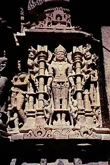 The Jain temple is dedicated to Mahavira and belongs to Śvētāmbara sect of Jainism. The temple is considered a testimony of architecture Gurjara-Pratihara dynasty.[17] This a large temple[18] surrounded by enclosing wall consisting of garbhagriha, mandapa. The temple features a sanctum, a closed hall, an open porch and an ornate Torana (gateway) and exquisite sculptures.[19][20] The temple has one closed and two pillared halls elongated the axis of principal shrine.[21] The torana in front of the sanctum is rich with ornate carvings of tirthankaras, 12 in padmasan posture and 4 kayotsarga positions.[22] The pillars of the temple feature intricate artwork are particular Maha-Maru tradition.[19][23] The temple has seven subsidiaries, four on the eastern and three of the western side of the sanctum.[24] These shrines are joined by pradaksinapatha. Eastern parts of the shrine have figures of Mahavira and Parshavanatha.[18] The Shikhara of the garbhagriha and subsidiary shrine are crowned with amalaka and kalasa.[14] The shikhara above mulprasad was constructed later with Māru-Gurjara architecture.[22]