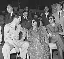 The first state visit to the USA was made in 27–30 April 1960. King Mahendra was accompanied by the Queen Ratna. They were received by President Dwight D. Eisenhower.[2][3]
