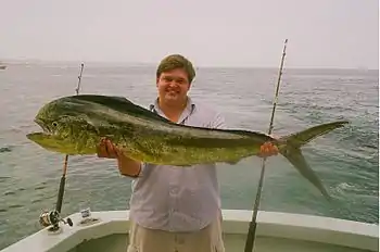 Mahi-mahi are swift and acrobatic game fish with striking colours. These colours darken when the fish dies (see illustrations)[1] The current IGFA all tackle record is 39.91 kilograms (88lb), caught in 1998 in Exuma, Bahamas by Dawson Strawbridge of North Augusta, SC.[2] Catches average 7 to 13 kilograms (15 to 29 lb), and any mahi-mahi over 18 kilograms (40 lb) is exceptional. Males are often larger than females.