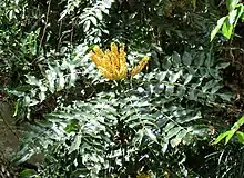 Mahonia napaulensis Nepali: जमाने मान्द्रो is a shrub in the family Berberidaceae described as a species in 1821.[2] It is native to China (Tibet, Yunnan, Sichuan) and the Himalayas (Nepal, Bhutan, Sikkim, Assam, Myanmar).[1] This species is used medicinally throughout the Sikkim Eastern Himalayas. [3]
