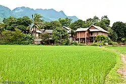 Mai Châu is a mountainous region located in Hòa Bình Province, approximately 135 km from Hanoi and 65 km from Hòa Bình. The east of Mai Châu borders Đà Bắc and Tân Lạc districts, the west and the south border Quan Hóa district of Thanh Hóa province, and the north borders Vân Hồ district of Sơn La province. Mai Châu's terrain is quite complex, divided by slits, streams and high mountains. According to the topographic characteristics, Mai Châu can be divided into two distinct areas: the low region (relatively flat terrain with fertile soil) and the high region (with many high and rugged mountain ranges).[2]