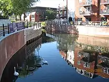 The Royal Borough of Windsor and Maidenhead set up the Partnership for the Rejuvenation of Maidenhead (PRoM) in December 2007,[4] which developed and proposed a 20 Year Vision and Action Plan for rejuvenating the town centre.[5] The comprehensive Area Action Plan was adopted in September 2011, after successive consultations.[6] It saw the restored waterway as one of the defining projects which would help to improve and shape the identity of the town for the future.[7] It also identified opportunity areas, where major developments based around housing and offices could take place. Three of these abutted the waterways, and would be enhanced by having a pleasant water outlook. These were the High Street and York Stream area just to the south of the A4 bridge, the York Road area on the north side of the railway, and the Stafferton Way area on the south side of the railway.[8] Such developments often contribute to the provision of community infrastructure through planning gain, which is negotiated under section 106 of the Town and Country Planning Act 1990, and is thus known as Section 106 money. The first of these became known as the Chapel Arches scheme, for which the developer was Shanly Homes. They built three developments, Waterside Quarter, The Picturehouse and Chapel Wharf, providing 259 homes and 30,000 square feet (2,800 m2) of commercial property.[9] The York Road development was managed as a joint venture between the Royal Borough and Countryside Partnerships South, who were awarded a contract in April 2017. Countryside specializes in place making and urban regeneration. This project included 229 homes, of which 68 were affordable properties, 20,000 square feet (1,900 m2) of commercial property for restaurants and cafes, and a new building to house the Maidenhead Heritage Centre.[10]