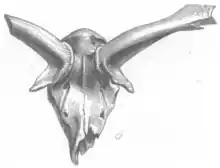 In the 19th Century the skull of an ancient Irish elk was "found in the parish of Cloone, barony of Mohill, county of Leitrim. This head was in the possession of a labourer, who said he found it in the river, under the village of Cloone. A very perfect, large head, measuring, from the occipital crest at top to the end of the mouth bone, 22 inches. The head is rather narrower than usual; a portion of each stem and both brow antlers are perfect. The palm of the brow antler is seven inches across ; there is some irre gularity in the crown of the left beam, as if from exuberant growth; a small tit-like projection, apparently the commencement of a third horn, springs from the bone beneath the base of the beam on this side. The colour of the whole is very dark, but both the bone and horn are in a fine state of preservation; it is heavier than any of the other specimens held by the Royal Irish Academy museum in Dublin."[16]