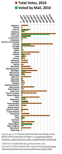 In the 2016 US Presidential election, approximately 33 million ballots were cast by postal vote, about a quarter of all ballots cast.[35] Some jurisdictions used only vote-by-mail and others absentee votes.
