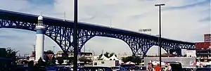 The Main Avenue (Harold H. Burton Memorial) Bridge (alternately Main Avenue Viaduct[2]) is a cantilever truss bridge in Cleveland, Ohio carrying Ohio State Route 2/Cleveland Memorial Shoreway over the Cuyahoga River.[3] The bridge, completed in 1939, is 8,000 feet (2,400 m) in length, and was the longest elevated structure in Ohio[4] until the 2007 completion of the Veterans' Glass City Skyway in Toledo. It was named for Harold H. Burton, 45th mayor of Cleveland, in late January 1986.[5] The bridge replaced an 1869 bridge at the same site,[4] and was built in conjunction with construction of the Cleveland Memorial Shoreway.[6]