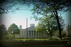 Main Building, Mitchell College is a historic building located on the campus of Mitchell Community College at Statesville, Iredell County, North Carolina. It was built in 1854–1856, and is a three-story stuccoed brick building with a heroic hexastyle Doric order portico in the Greek Revival style. It is T-shaped in plan, 13 bays wide and 3 bays deep, with a five-bay-deep and three-bay-wide wing. Atop the roof is an octagonal wooden cupola. An east wing, Shearer Music Hall, was added to the structure in 1907.[2]
