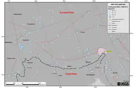 The MFT accommodates almost the entire rate of subduction of the Indian Plate therefore, it is no surprise that numerous earthquakes have occurred along this fault, and is expected to produce very big earthquakes in the future.[5] Many earthquakes associated with the MFT has resulted in visible ground ruptures, as seen in the Bihar earthquake of 1934 and 1505 magnitude 8.2-8.8 earthquake.