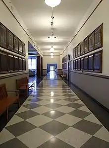 The Main Library's lobbies, circulation spaces, and second-floor reading room retain their elaborately-detailed historic features. The reading room has 27 stained glass windows showing Renaissance printer's marks, and four Barry Faulkner murals decorate the walls of the central stairwell.[11] The functional spaces and secondary areas of the library interior, which were originally fitted more simply than the public spaces, still retain their original wood trim.[4]