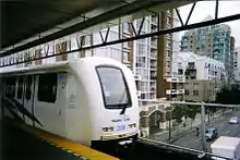 As part of a plan to upgrade high-traffic stations along the Expo Line, and to enable the addition of fare gates to the station in conjunction with the broader system-wide Compass smartcard initiative, construction began on a major refurbishment of Main Street–Science World in early 2013.[2] In 2014, due to ongoing construction, the platform length was shortened, preventing four- and six-car trains from stopping at the station. As a result, TransLink introduced the Train2Main service, which consisted of a two-car shuttle train that served the station and ran between Waterfront and Commercial–Broadway stations,[3] with longer trains skipping Main Street–Science World during this period. This service ran between March 30 and December 6, 2014.[4][5]