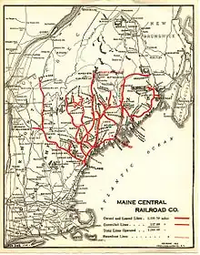 The Maine Central Railroad (reporting mark MEC) was a U. S. class 1 railroad[2] in central and southern Maine. It was chartered in 1856 and began operations in 1862. By 1884, Maine Central was the longest railroad in New England. Maine Central had expanded to 1,358 miles (2,185 km) when the United States Railroad Administration assumed control in 1917. The main line extended from South Portland, Maine, east to the Canada–United States border with New Brunswick, and a Mountain Division extended west from Portland to St. Johnsbury, Vermont, and north into Quebec. The main line was double track from South Portland to Royal Junction, where it split into a "lower road" through Brunswick and Augusta and a "back road" through Lewiston, which converged at Waterville into single track to Bangor and points east. Branch lines served the industrial center of Rumford, a resort hotel on Moosehead Lake and coastal communities from Bath to Eastport.[3]