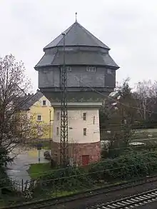 The Prussian-Hessian Railway Company created a hub of national significance at Bischofsheim. As a result, freight and passenger facilities were spatially separated. The old station building at the water tower (both of which are listed as monuments under the Hessian heritage law[5]) was now used for handling freight. A new entrance building was built for passengers in 1904, a few hundred metres to the north-west.