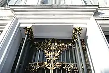 The neoclassical façade is covered with a white coating. The entrance door is detached, consisting of black cast iron columns decorated with golden leaves (1908) and fuchsia flowers of the same color.[2] The house has very refined details. Each piece has a flower theme.[3] The lobby has for example the theme of pink and orchid. A canopy with wooden beams overlooks the living room, which was decorated in 1911 by 15 pâte de verres of Amalric Walter representing the Belfry of Thuin and the river Sambre.[2][4]