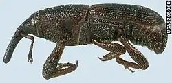 The maize weevil (Sitophilus zeamais), known in the United States as the greater rice weevil,[1][2] is a species of beetle in the family Curculionidae. It can be found in numerous tropical areas around the world, and in the United States, and is a major pest of maize.[3] This species attacks both standing crops and stored cereal products, including wheat, rice, sorghum,[4][5][6] oats, barley, rye, buckwheat,[6] peas, and cottonseed. The maize weevil also infests other types of stored, processed cereal products such as pasta, cassava,[5] and various coarse, milled grains. It has even been known to attack fruit while in storage, such as apples.[7]