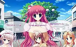 The gameplay requires little interaction from the player as most of the duration of the game is spent on simply reading the text that will appear on the screen; this text represents either dialogue between the various characters, or the inner thoughts of the protagonist.[1] Every so often, the player will come to a "decision point" where they are given the chance to choose from options that are displayed on the screen, typically two to three at a time.[1] During these times, gameplay pauses until a choice is made that furthers the plot in a specific direction, depending on which choice the player makes.[1] There are five main plot lines that the player will have the chance to experience, one for each of the five heroines in the story.[1] In order to view the five plot lines to their entirety, the player will have to replay the game multiple times and choose different choices during the decision points in order to further the plot in an alternate direction.[1] Throughout gameplay, there are scenes depicting Takayuki and a given heroine having sexual intercourse.[2]