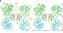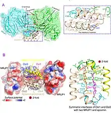 ![]() MRJP1 oligomer showing the H-like complex structure that contains four MRJP1 (green or cyan), four apisimin (yellow or wheat), and eight 24-methylenecholesterol (blue, purple, orange, or lime sticks) molecules | |||||||