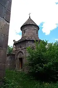 Outside of these is a small Surb Astvatsatsin (Holy Mother of God) church attributed to Abbot Hovhannes in 1198 in memory of his parents and brothers, with sculpted a portal.