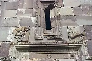 The narthex is four-columned. Built before 1207, it catered to both temples at the same time. It contains a door which led to the communion bread bakery, a small vaulted room. The decoration of the narthex is subordinated to the artistic features of the main temple, which shows especially clearly in ornamental carving. The western portal has, like that of Geghard narthex, a stepped framing that includes the window above. Bas-reliefs are carved on the middle ledge, at the sides of the window. At the right side there is a winged sphinx with a crown on its head, and at the left side a lion attacking an ox.