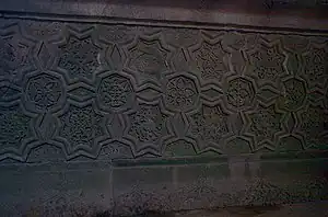 The shaft of the south-western column of the interior is girdled with an eight-arch arcature, the capital is accentuated, on the transversal axis, by a large rosette above which, on the face of the arch, there is a relief representation of a dove with a lifted wing. The abutment on the western side, corresponding to the column, has smaller vertical divisions than the other wall-attached abutments. Rosettes of various designs, painted white, yellow and red, were cut on the flat ceilings of the corner sections. The decoration of the central section was richer. Floral ornaments covering the shield-shaped pendentives show birds in various attitudes. The girth of transition to the 20-hedral base of the ceiling which probably consisted of six intersecting arches is composed of groove-divided triangular slabs, vertical and inclined.