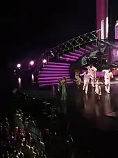 Aside from the televised appearances and charity events, "Make It Happen" was featured on the set lists of several of Carey's world tours. The song was routinely performed on the Music Box Tour and the Daydream World Tour in 1993 and early-mid 1996, respectively. During her first show at Japan's Tokyo Dome on March 7, 1996, Carey performed the song alongside a twenty-five person choir and several additional musicians and background vocalists. "Make It Happen" was featured on Carey's Butterfly World Tour in early 1998, during which she was joined on stage by several choir members and musicians. Similarly, two years later, the song was placed as the ninth song on the set list during select dates of her Rainbow World Tour. Similar set-ups were featured for her following Charmbracelet World Tour and The Adventures of Mimi Tour, where church choirs were brought out for the song, in addition to additional background vocalists and musicians. In the Angels Advocate Tour, the song served as a dancer's interlude; Carey entered during the bridge of the song. On September 26, 2010, during the song's performance in a show in Singapore for that tour, Carey slipped on stage, and the small slip was blamed on Carey's US$10,000 heels.[49] She asked her assistant to remove them and completed the concert barefoot.[50] Carey started performing the single for the first time since November 2014 on her second concert residency placed in Las Vegas, The Butterfly Returns (2018).