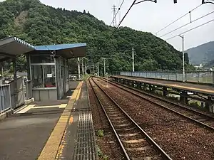 The station consists of two opposed side platforms on an embankment. The station is unattended. The use of wye switches charges passing trains the speed limit of 40 km/h. There is no station building except for shelters on the platforms.[1]