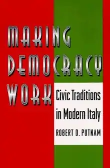 Making Democracy Work: Civic Traditions in Modern Italy (ISBN 9780691037387) is a 1993 book written by Robert D. Putnam (with Robert Leonardi and Raffaella Y. Nanetti). Published by Princeton University Press, the book's central thesis is that social capital is key to high institutional performance and the maintenance of democracy.