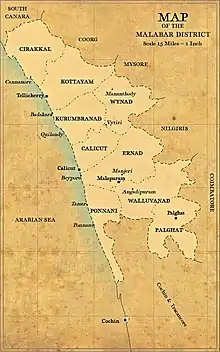 Malabar District, also known as Malayalam District,[1][2] was an administrative district on the southwestern Malabar Coast of Bombay Presidency (1792-1800)[3] and Madras Presidency (1800-1947)[4] in British India, and independent India's Madras State (1947-1956). It was the most populous and the third-largest district in the erstwhile Madras State.[5] The British district included the present-day districts of Kannur, Kozhikode, Wayanad, Malappuram, Palakkad (excluding Chittur taluk), Chavakad Taluk and parts of Kodungallur Taluk of Thrissur district (former part of Ponnani Taluk), and Fort Kochi area of Ernakulam district in the northern and central parts of present Kerala state, the Lakshadweep Islands, and a major portion of the Nilgiris district in Tamil Nadu. The detached settlements of Tangasseri and Anchuthengu, which were British colonies within the kingdom of Travancore in southern Kerala, also formed part of Malabar District until 1927.[6] Malayalam was the administrative as well as the most spoken lingua franca of Malabar District during British Rule. Jeseri, a distinct dialect of Malayalam, was spoken in the Laccadive Islands. Malabar District merged with the erstwhile state of Travancore-Cochin (1950-1956) to form Kerala according to the States Reorganisation Act, 1956.[7] On the same day, the present Kasaragod district of South Canara District was also attached to Malabar, and the Laccadive & Minicoy Islands of Malabar were reorganised to form a new Union Territory.[7] Malabar was trifurcated to form the districts of Kannur,[8] Kozhikode,[9] and Palakkad,[10] on 1 January 1957.