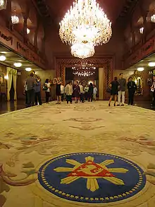 An elaborate ceiling was installed in the 1930s, carved by noted sculptor Isabelo Tampingco who depicted vases of flowers against a lattice background. Large mirrors, gilt sofas and armchairs, and Chinese bronze pedestals holding plant and flower arrangements decorate the Hall. The Tampingco woodwork was curved and in some eyes gave the room a coffin shape. This is supposedly why in the 1979 renovation, the Tampingcos were replaced with two facing balconies.[13]