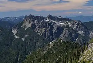 The Alpine Lakes Wilderness features some of the most rugged topography in the Cascade Range with craggy peaks and ridges, deep glacial valleys, and granite walls spotted with over 700 mountain lakes.[5] Geological events occurring many years ago created the diverse topography and drastic elevation changes over the Cascade Range leading to the various climate differences.