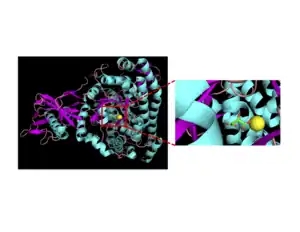 Malate synthases fall into two major families, isoforms A and G. Isoform G is monomeric with a size of about 80-kD and found exclusively in bacteria.[2] Isoform A is about 65 kD per subunit and can form homomultimers in eukaryotes.[3] This enzyme contains a central TIM barrel sandwiched between an N-terminal alpha-helical clasp and an alpha/beta domain stemming from two insertions into the TIM barrel sequence. The enzyme terminates with a C-terminal five-helix plug. The active site, where the acetyl-CoA and glyoxylate bind to the enzyme, lies between the TIM barrel and C-terminal plug.[4] Upon binding, the acetyl-CoA molecule forms a J-shape inserted into the binding pocket, by an intramolecular hydrogen bond between N7 of the adenine ring and a hydroxyl group on the pantetheine tail.[4] In addition, a critical magnesium ion within the active site coordinates with glyoxylate, glutamic acid 427, aspartic acid 455, and two water molecules.[4] The amino acids interacting with acetyl CoA upon binding are highly conserved.[2] Sequence identity is high within each class of isoforms, but between both classes sequence identity drops to about 15%.[5] The alpha/beta domain, which has no apparent function, is not seen in isoform A.[6]