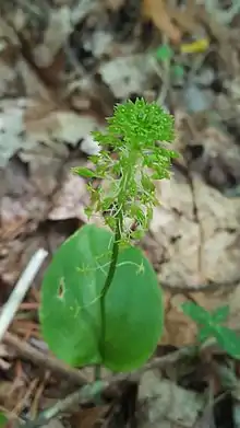 Malaxis unifolia, or the green adder's-mouth orchid,[2] is a species of orchid occurring from eastern and central Canada (Newfoundland to Manitoba),[3] the central and eastern United States (Maine to Florida, west as far as Minnesota, eastern Kansas, and eastern Texas),[4] Mexico,[5] Central America and the Greater Antilles (Cuba, Jamaica, Dominican Republic).[6][7][8]