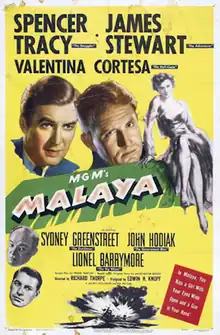 Malaya is a 1949 American war film set in colonial Malaya during World War II directed by Richard Thorpe and starring Spencer Tracy, James Stewart and Valentina Cortese. The supporting cast features Sydney Greenstreet, John Hodiak, and Lionel Barrymore, with Richard Loo and Gilbert Roland. It was produced by Metro-Goldwyn-Mayer.