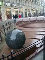 In 1999 Malaya Sadovaya Street was turned into a pedestrian zone.[2] The street was paved with tiles, the separation between street and sidewalk was removed, benches were added, pipes were laid under the streets carrying heated water to keep the street free of snow and ice,[2] and a fountain featuring a Kugel ball (a heavy stone ball easily rotatable because of lubrication by the fountain's water) was built.