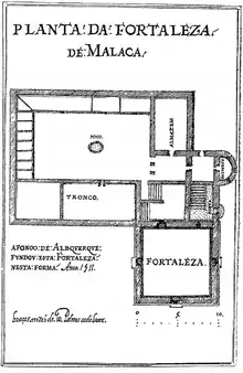 Contrary to Sultan Mahmud Shah's hopes, Albuquerque did not wish to just sack the city, but to hold it permanently. To that effect he ordered the construction of a fortress close to the shoreline, which became known as A Famosa, due to its unusually tall keep, over eighteen meters/59 feet high. Stone was brought in by ships as there wasn't enough in the city for its completion. It had a garrison of 500 men, 200 of which were dedicated to the service aboard the 10 ships left behind as the fortress' service fleet.[66] After the conquest, the Portuguese found a sepulcher (rock-cut tomb) below the ground, which stones were used to build the fortress. Additional stones were sourced from the walls and foundation of the Malaccan mosque.[67][68]