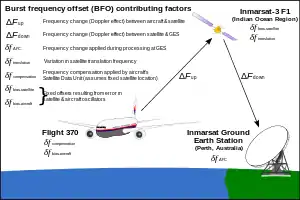 - Burst frequency offset (BFO) – The difference between the expected and received frequency of transmissions. The difference is caused by doppler shift as the signals traveled from the aircraft to the satellite to the ground station; the frequency translations made in the satellite and at the ground station; a small, constant error (bias) in the SDU that results from drift and ageing; and compensation applied by the SDU to counter the Doppler shift on the uplink. This measure can be analysed to determine where along the BTO rings the aircraft was located.[11]: 9–11 [12]: 18