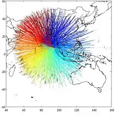 An analysis of the time difference between the transmission of the ping and the aircraft's response allowed Inmarsat to determine the aircraft's distance from the satellite. This resulted in two arcs—referred to as the "northern corridor" and "southern corridor"—where the aircraft may have been located at the time of its last complete handshake at 08:11.[48] Using an "innovative technique"[15] that has "never before [been] used in an investigation of this sort",[49] the team determined it could also use the burst frequency offset to determine the aircraft's speed and position along the identified arcs. Inmarsat cross-checked its methodology to known flight data from six Boeing 777 aircraft flying in various directions on the same day, and found a good match.[13] Applying the technique to the handshake signals from Flight 370 gave results that correlated strongly with the expected and actual measurements of a southern trajectory over the Indian Ocean, but poorly with a northern trajectory.[13][15][50] Further revised calculations to account for movements of the satellite relative to the earth allowed the northern corridor to be ruled out completely. This analysis was passed on to Malaysian authorities on 23 March.[6]