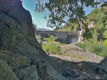 A gated dam-bridge is located at the lake's southern end.[17] When the area receives 4 inches (100 mm) or more of rain, the lake often overflows.[18] The water flows down Malibu Creek to the ocean at the Malibu Lagoon.