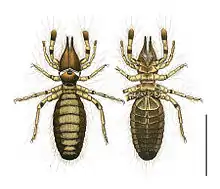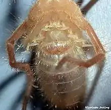 Malleolus (plural: malleoli) is a fan-shaped chemoreceptor or racquet organ, an array of which are carried in pairs on the ventral or undersides of Solpugidae. They are the counterpart of pectines in scorpions, and modified walking limbs in the uropygids and amblypygids.[1][2] Most species have 5 pairs of malleoli on the ventral surface of the fourth pair of legs of both sexes, while juveniles and other species have 2-3 pairs.[3]