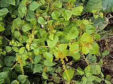 Usually growing as a liana, sometimes a climbing shrub or a shrub, it can grow 5-10 tall or in length, at times the stems can be up to 22 cm in diameter.[3] [4][5] It is one of the only Mallotus species to grow as a liana.[6] Bark is dark brownish grey.[7] Branchlets, petioles and inflorescences are dull yellowish-brown. The blaze (longitudinal cut of the bark) is finely layered, with an odour of green peas (Pisum sativum). The simple and broad leaves are slightly peltate.[8] Flowers are yellowish. It flowers in China from March to May, and fruits from June to September. The species can be distinguished from other Mallotus species, by its being a climber and that its upper leaf surface have more than 2 marginal extrafloral nectaries, and that its fruits are (1-or) 2- or 3-locular.[7] A molecular phylogeny study has M. repandus as a sister species of M. phillippensis (Lam.) Muell.Arg.[9] The indumentum/hairs on the leaves of the plant are simple and multicellular, a trait only found amongst the Mallotus genera in the closely related M. philippensis.[6]