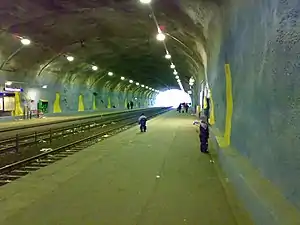 Trains initially stopped in the south side of the tunnel. As the construction of residential buildings in Malminkartano reached the plots north of the tunnel, the stopping point was moved to its midway point to function as a compromise between the original residents south of the tunnel and the new users of the station to its north.[3]