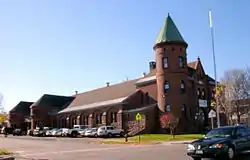 Malone Armory is a historic National Guard armory building located at Malone in Franklin County, New York. It is a brick and stone castle-like structure built in 1892, designed to be reminiscent of medieval military structures in Europe. It was designed by State Architect Isaac G. Perry. It consists of a 2-story, steeply pitched hipped roofed administration building with an attached 1+1⁄2-story, gable-roofed drill shed. The building is built of Potsdam sandstone and features a 3+1⁄2-story round tower on the administration building.[2]