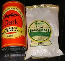 Malt extract is frequently used in the brewing of beer. Its production begins by germinating barley grain in a process known as malting, immersing barley in water to encourage the grain to sprout, then drying it to halt the progress when the sprouting begins. The drying step stops the sprouting, but the enzymes remain active due to the low temperatures used in base malt production.[20] In one before-and-after comparison, malting decreased barley's extractable starch content by about 7% on a dry matter basis and turned that portion into various other carbohydrates.[21]