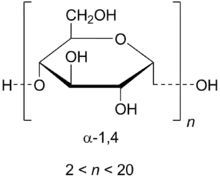 Maltodextrin consists of D-glucose units connected in chains of variable length. The glucose units are primarily linked with α(1→4) glycosidic bonds, like that seen in the linear derivative of glycogen (after the removal of α1,6- branching). Maltodextrin is typically composed of a mixture of chains that vary from three to 17 glucose units long.